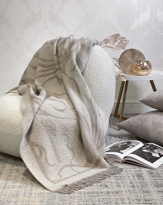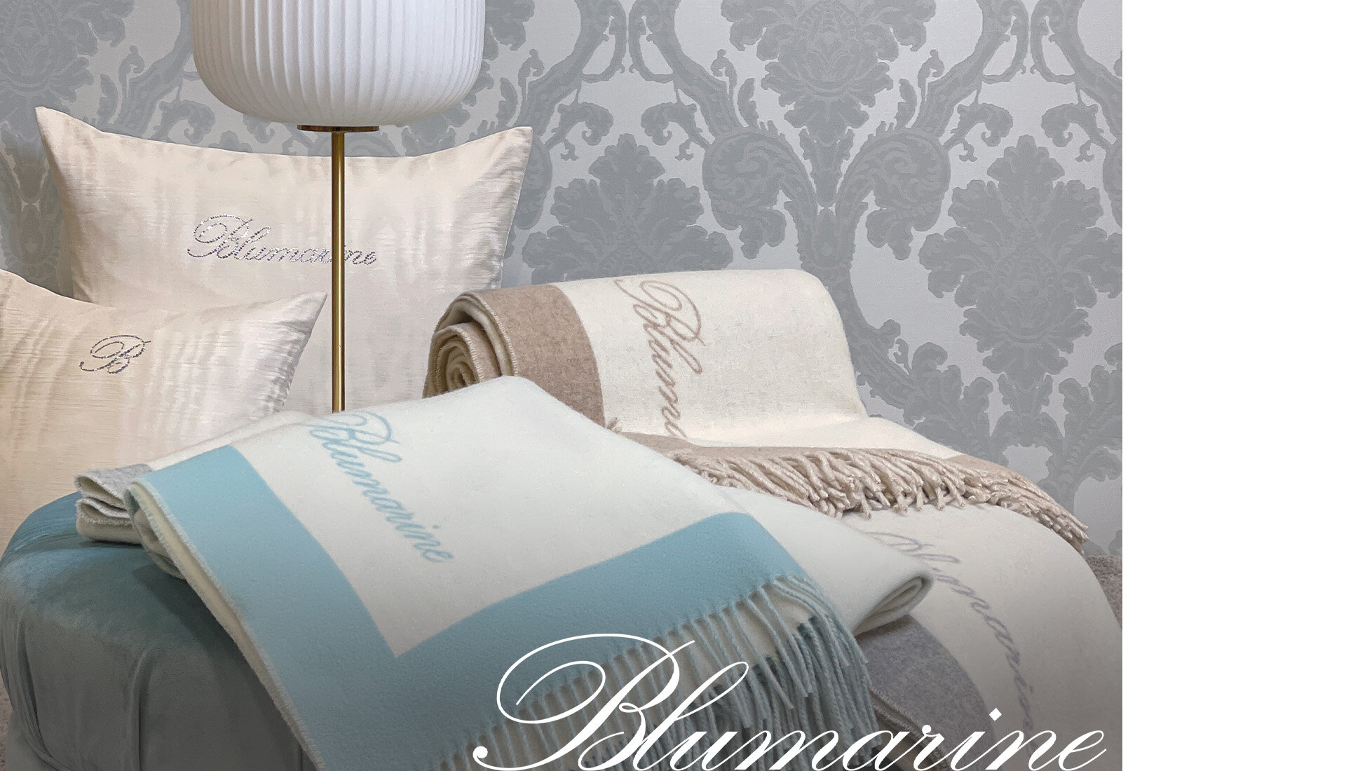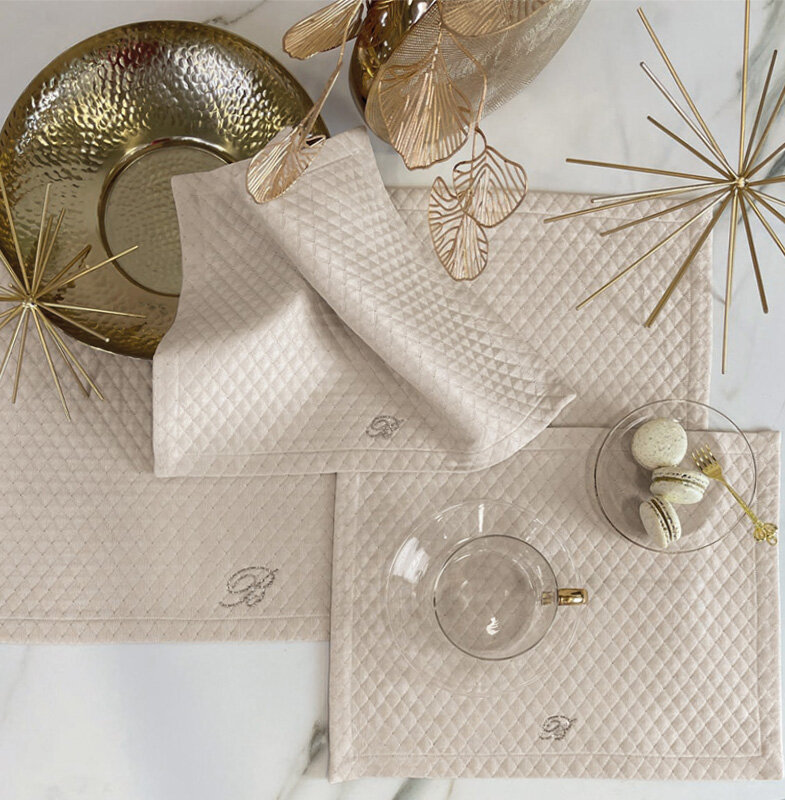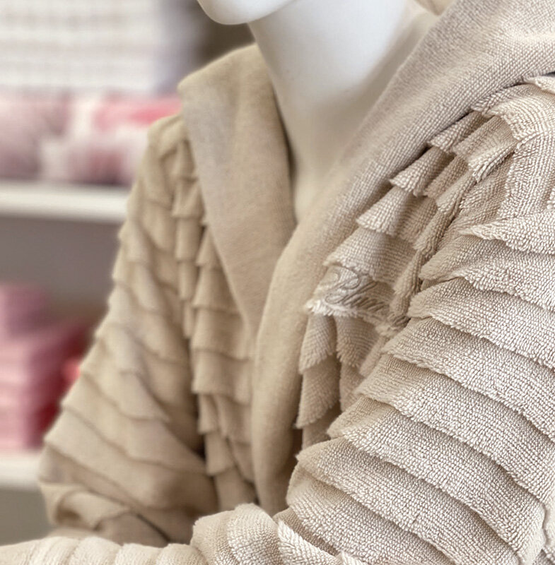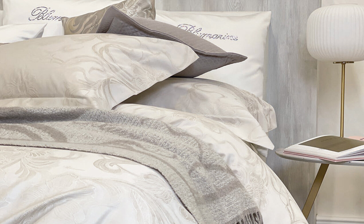 The coordinated range between double bed quilts, made of satin, cotton and with jacquard patterns, the bedspreads with ruffles, smooth, printed and quilted, the duvet cover sets, double bed sheets with ruffles, printed, satin and applied with precious lace, pillows embellished with rhinestones and Swarovski® crystals. Coordinated sets for the bathroom include terry-cloth set with decorations in Swarovski® crystals, organza decorations, bath towels with applied embroidery, 5 piece terry-cloth set with rhinestones, bathrobes with macramé lace, embroidery and Swarovski® applications and bath rugs.