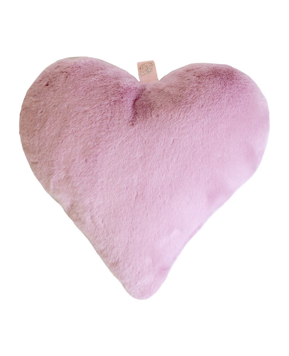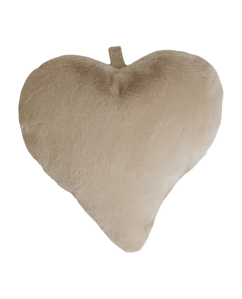 Big heart-shaped decorative cushion in faux fur with Blumarine logo in crystals on a grosgrain band.