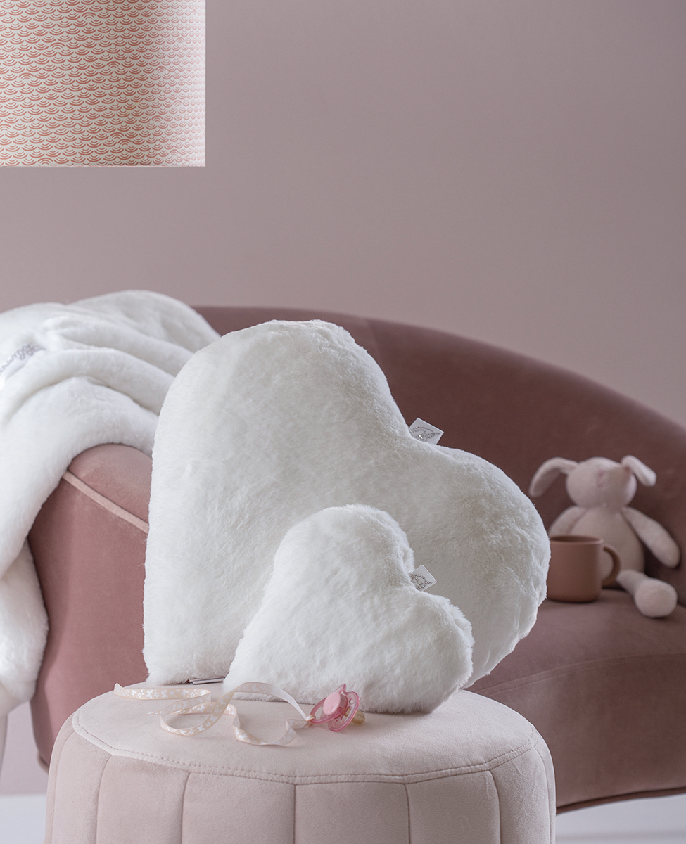 Small heart-shaped cushion in faux fur with Blumarine logo in crystals on a grosgrain band.