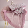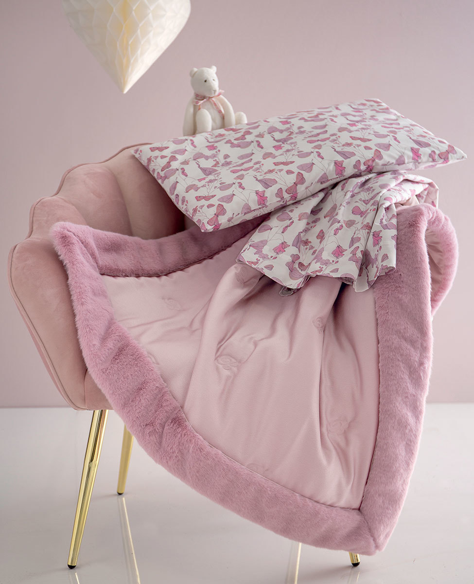 Elegant quilted bedspread for baby bed in plain taffeta with faux fur border on three sides.