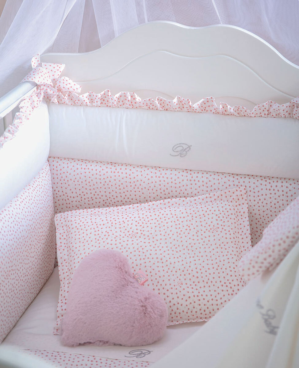 • bumper 205x45 cm in printed percale with central band in solid color and logo in crystals, stuffing in polyester fibers 550 g/sqm.