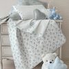 Quilted bedspread for baby cradle in cotton percale with all over print and Blumarine logo in Swarovski crystals.