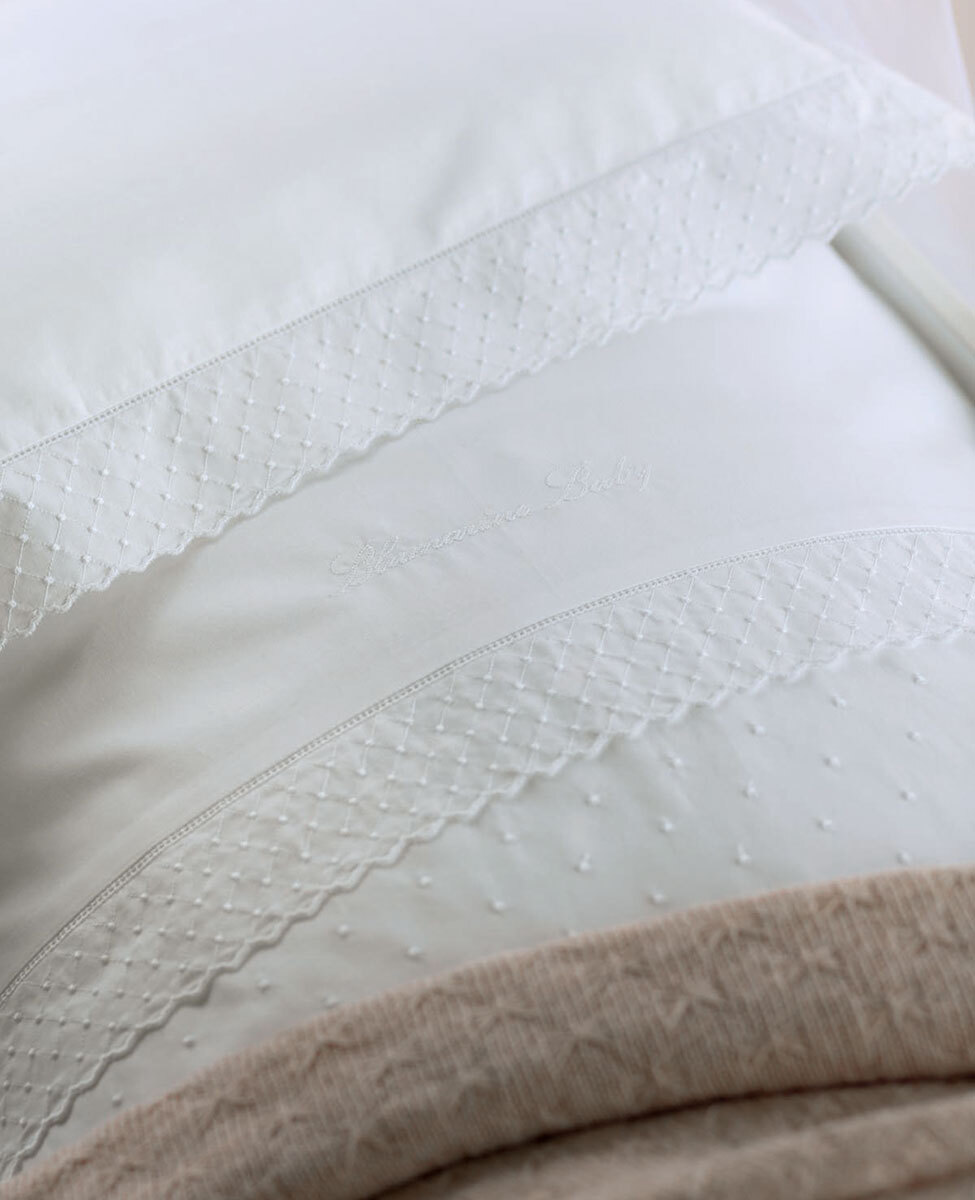 • pillowcase 40x30 cm with 3 flounces in plain cotton with embroidered bands finished with hemstitch