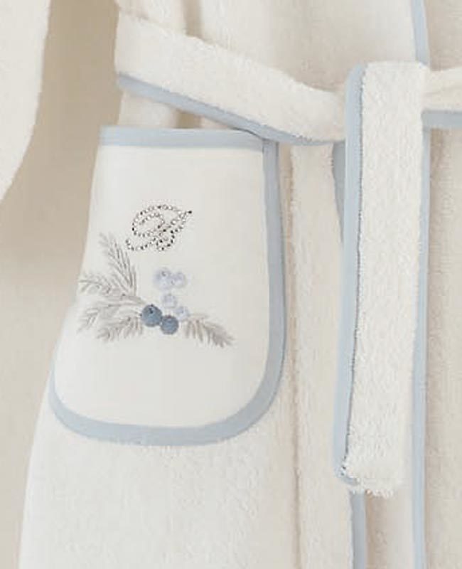 Baby bathrobe for 3/4 years old with bordered hood, delicate embroidery and Blumarine monogram in Swarovski crystals.