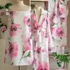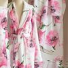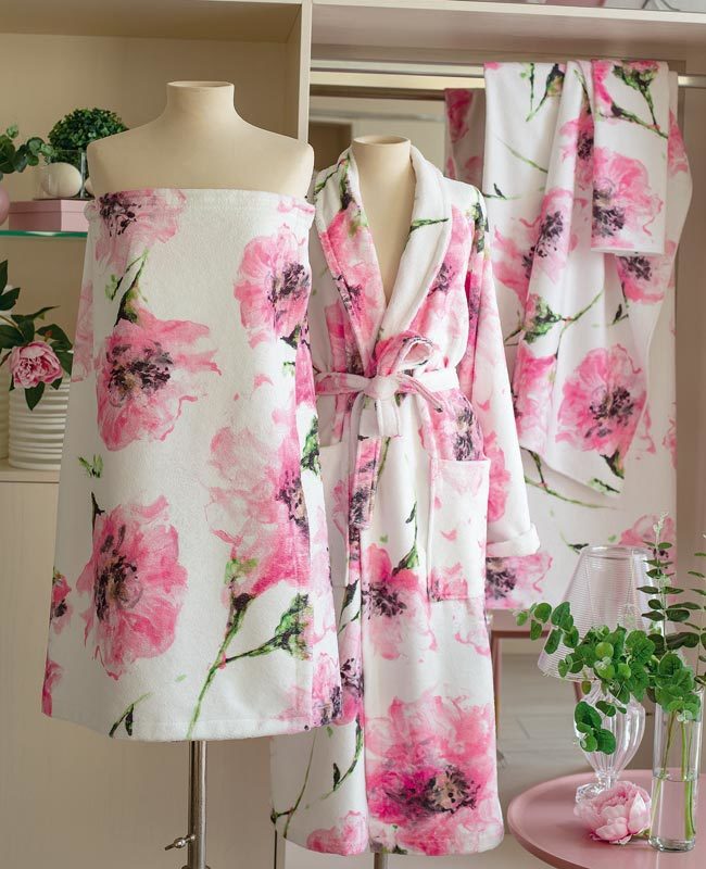 Bathrobe in printed velour with shawl collar and back side in terry cloth, size medium. The romantic bathroom watercolour flowers. The feminine essentials.