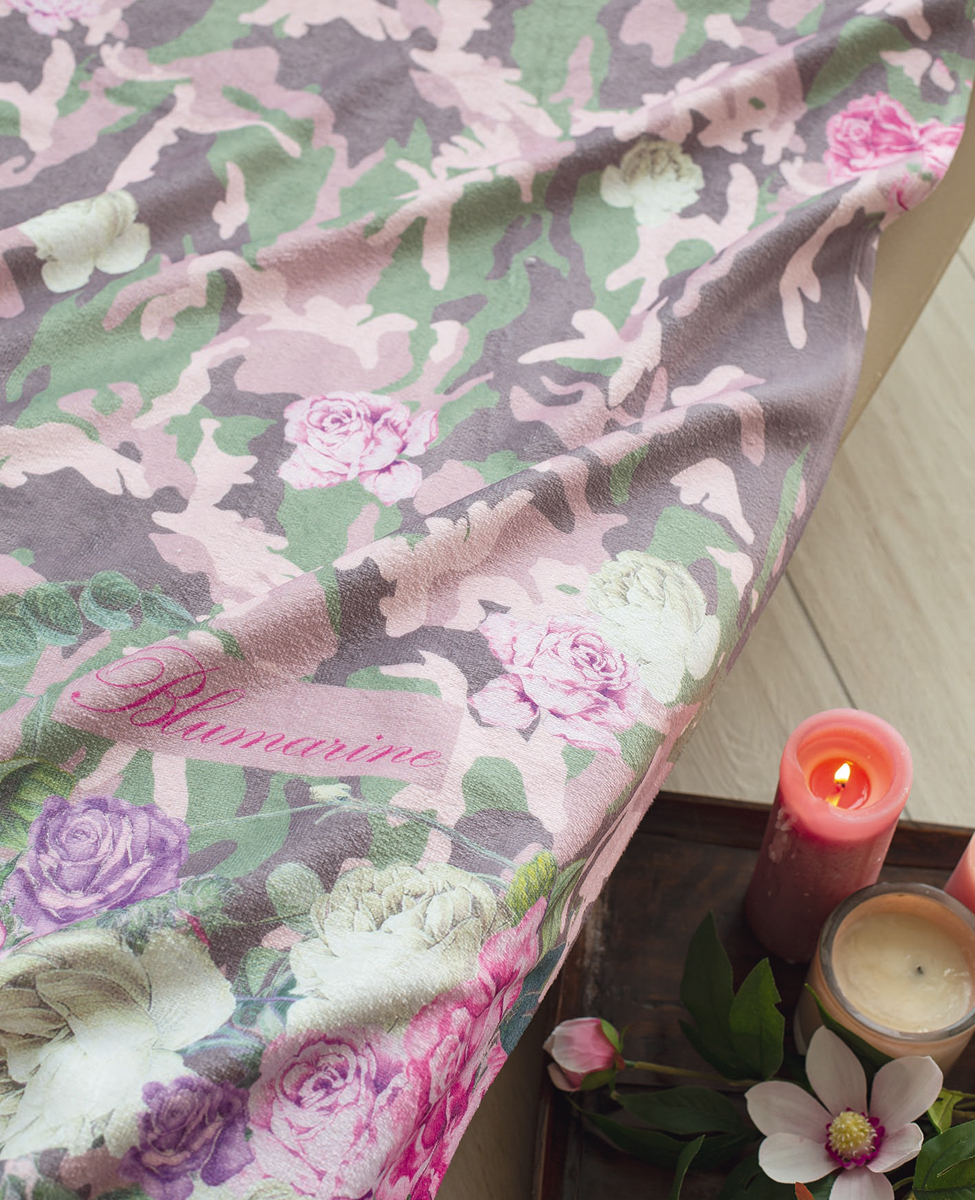 Maxi beach and bath towel with printed floral pattern and Blumarine logo printed in the pattern.