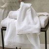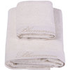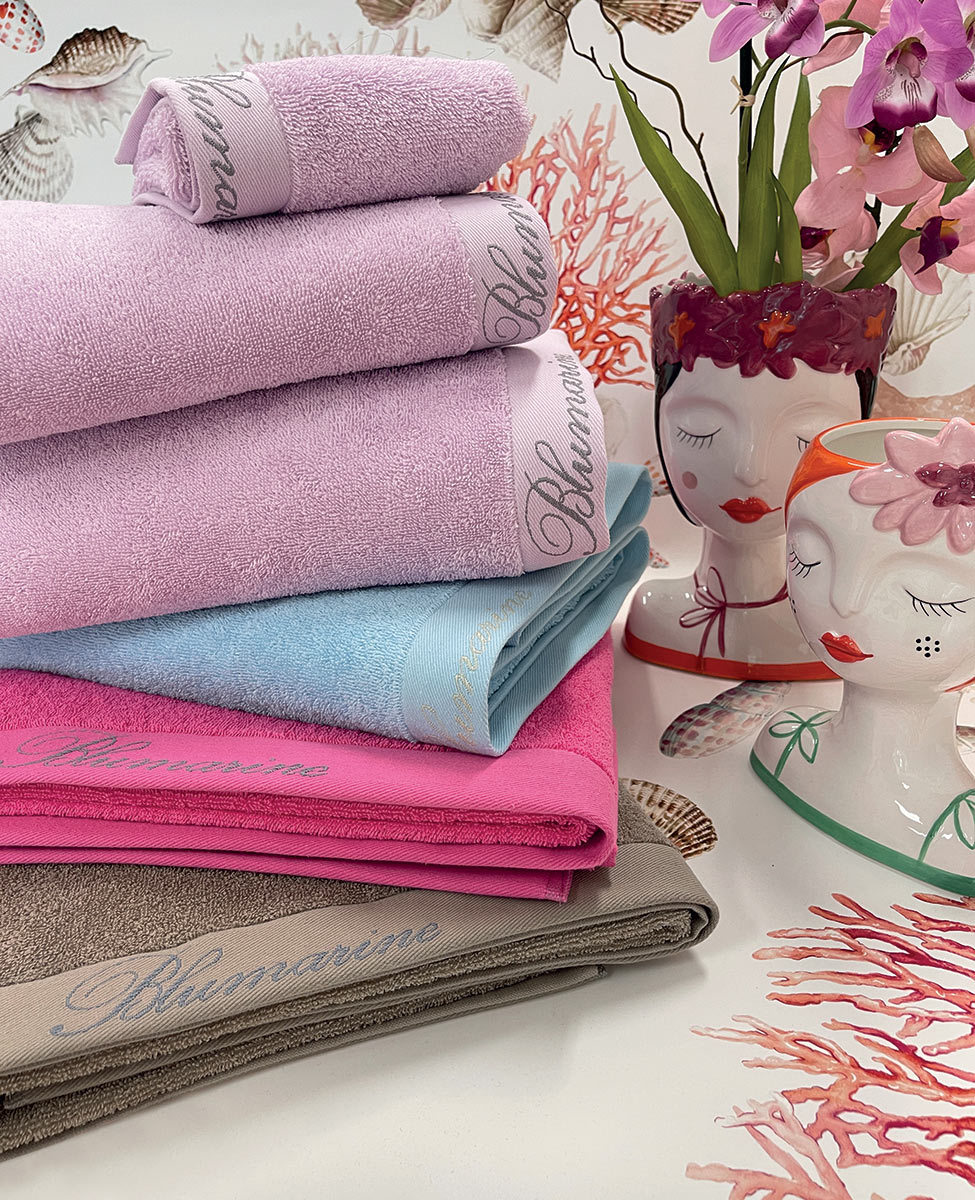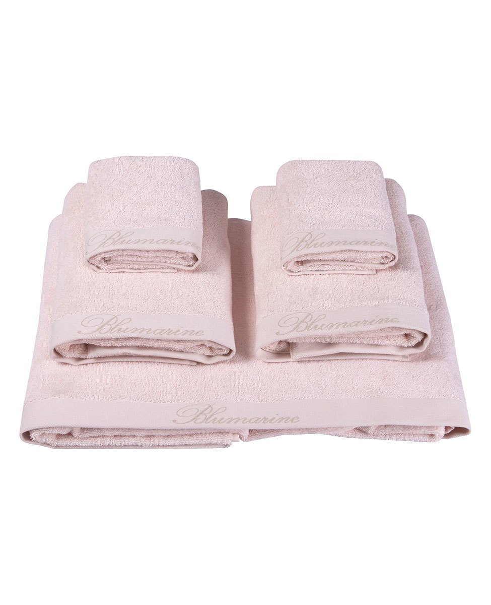 Towel set 5 pieces in solid color terry cloth, with jacquard border and Blumarine logo.