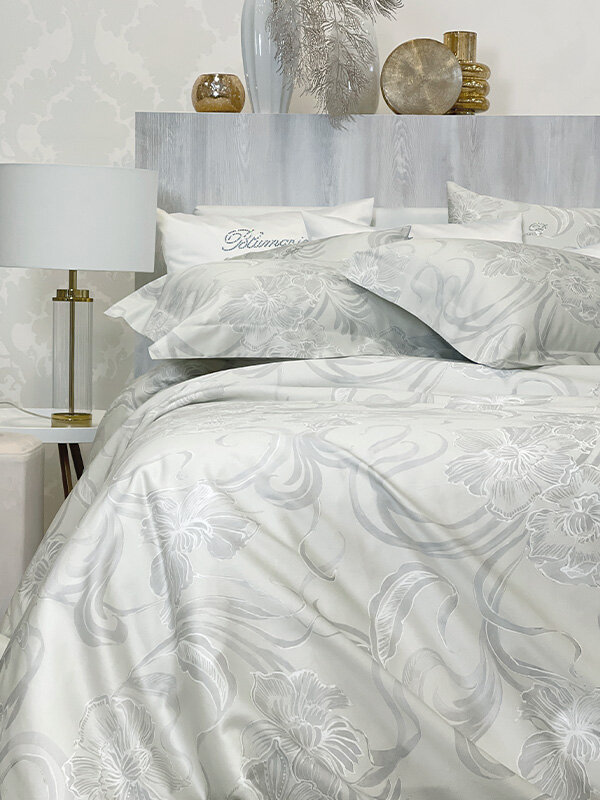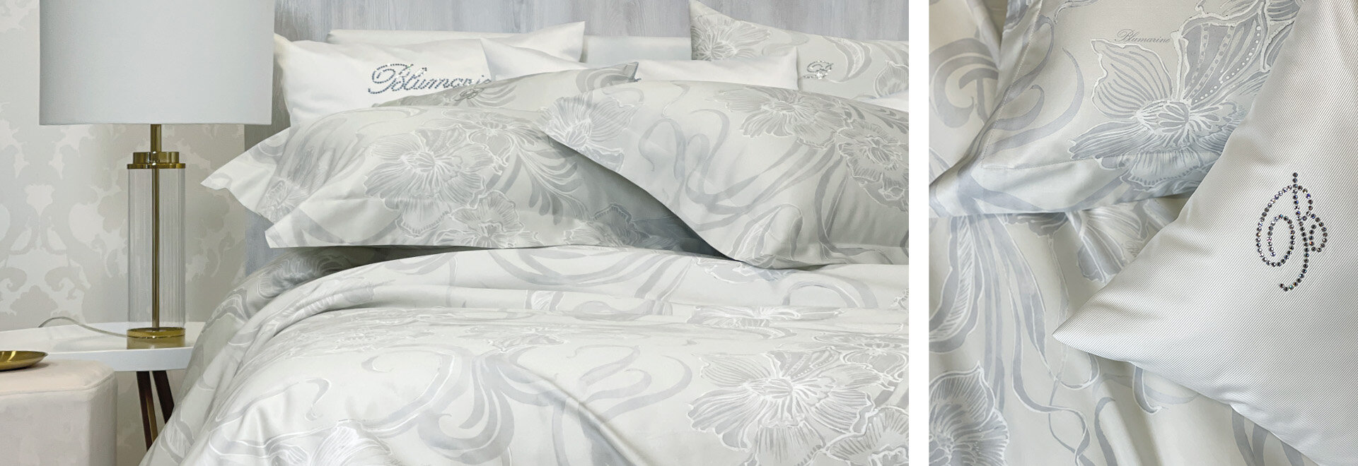 The iconic touch of the Blumarine brand is given by the presence of the embroidered logo or applied in Swarovski® crystals, a precious detail that discreetly reflects light, giving brightness and refinement to the bed. This is complemented by decorative elements such as lace inserts, embroidered borders, tone-on-tone appliqués and finishes that enhance the lines of the bedspreads.