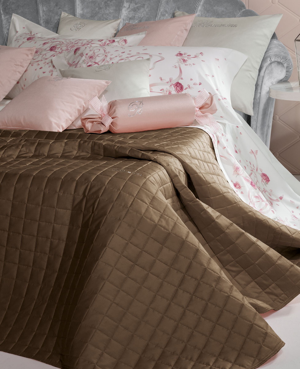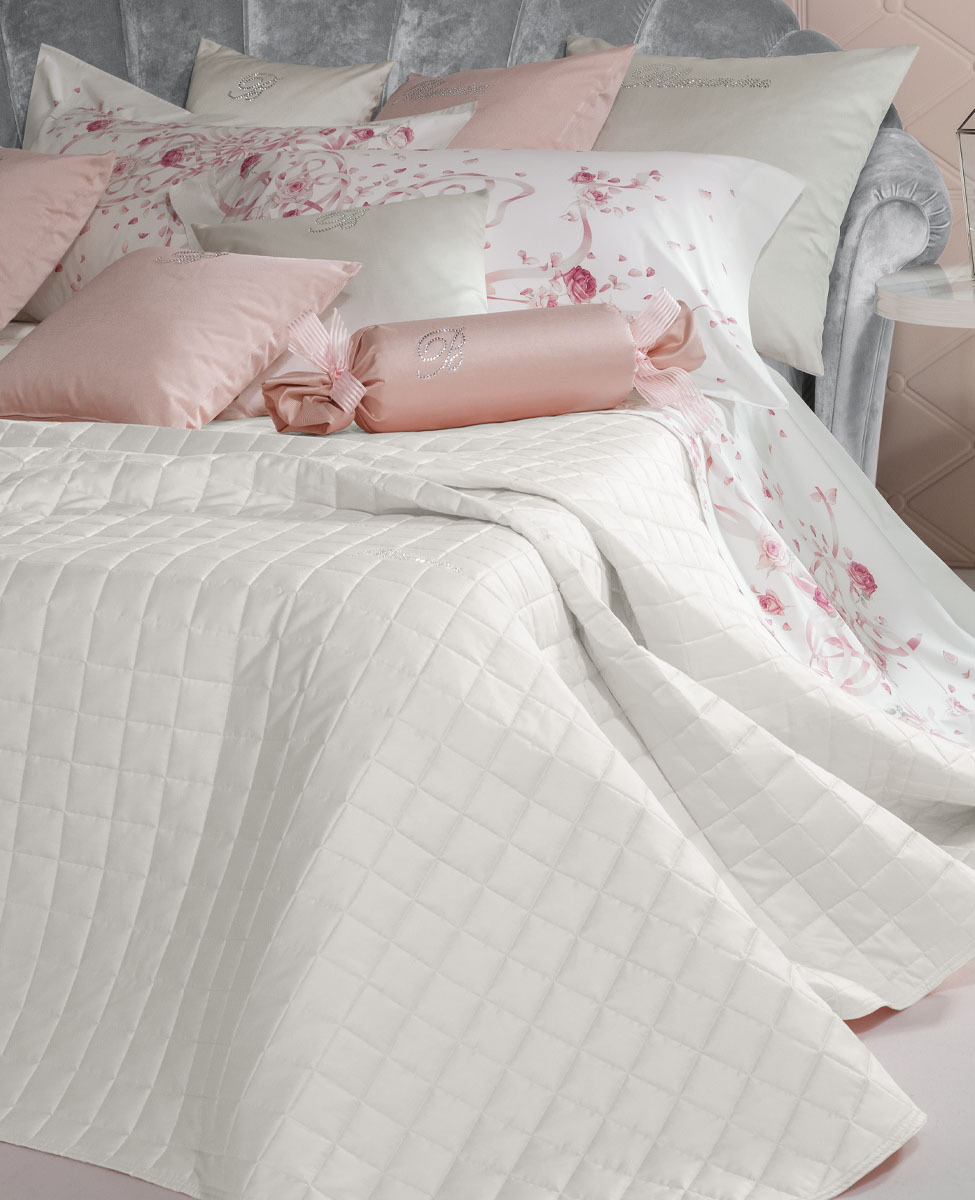 Bedspread in plain pure cotton sateen with Blumarine logo in Swarovski crystals. 11 colours available, from delicate color tones of powder and butter, to the strongest ones of wax, heather and rock.