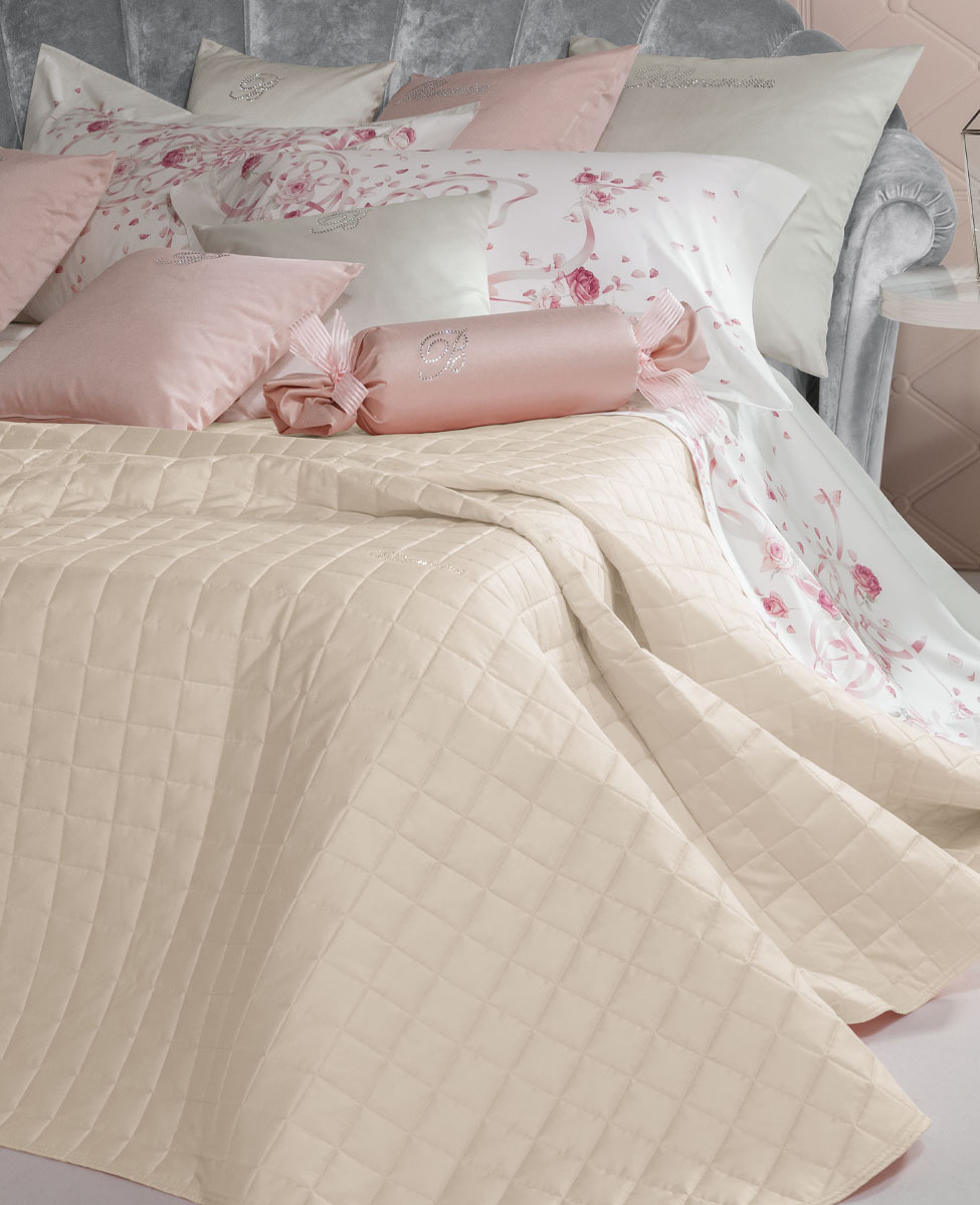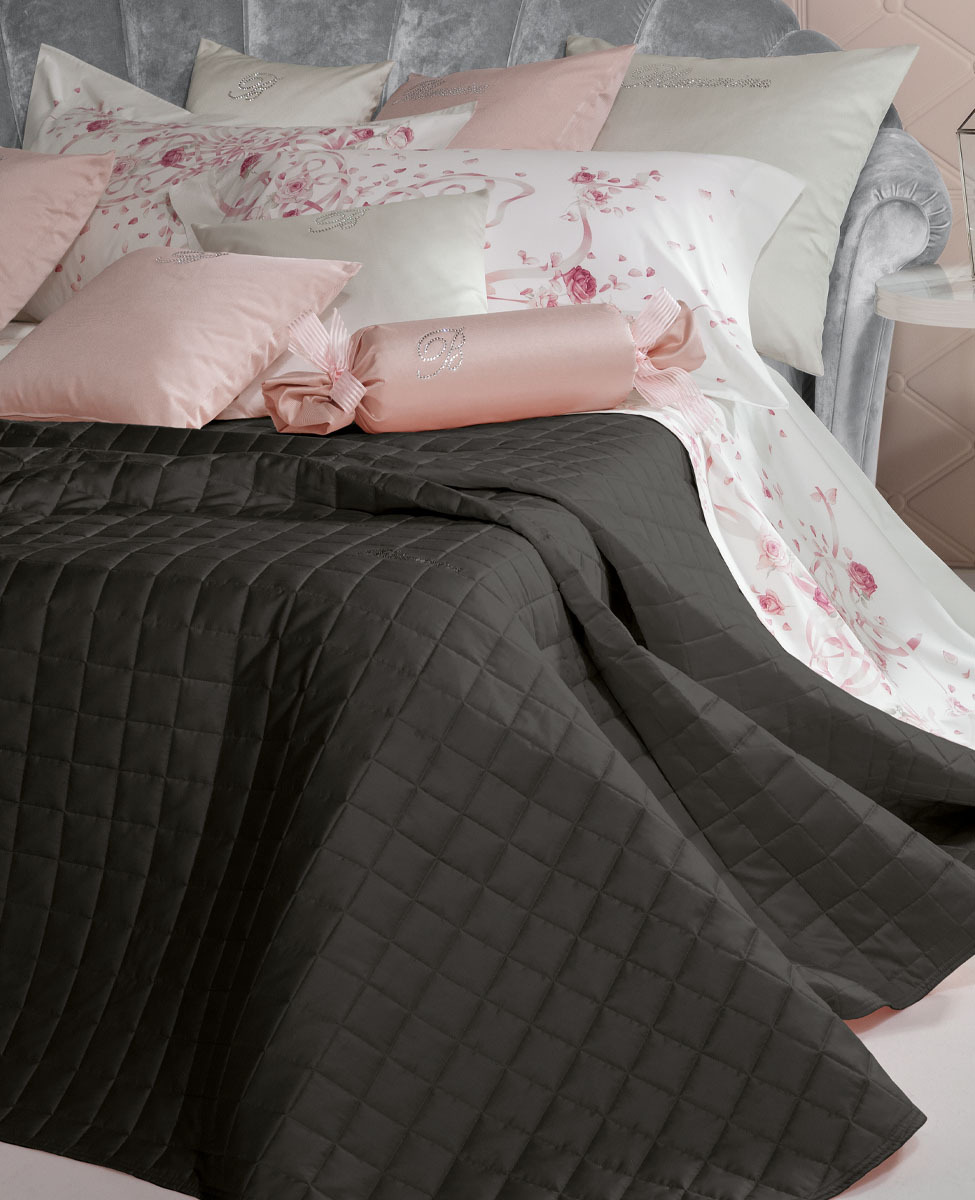 Bedspread in plain pure cotton sateen with Blumarine logo in Swarovski crystals. 11 colours available, from delicate color tones of powder and butter, to the strongest ones of wax, heather and rock.