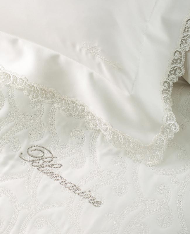 Bedspread for double bed embroidered with Blumarine logo in Swarovski crystals. Supreme details.