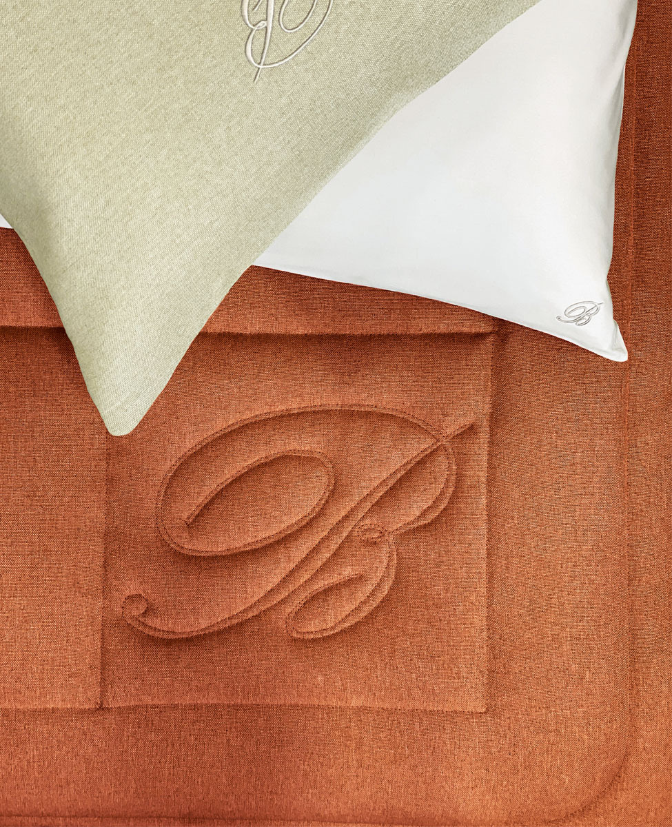Comforter for double bed in yarn-dyed solid color fabric, B monogram in the quilted pattern.