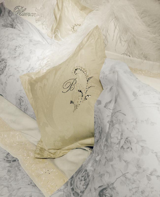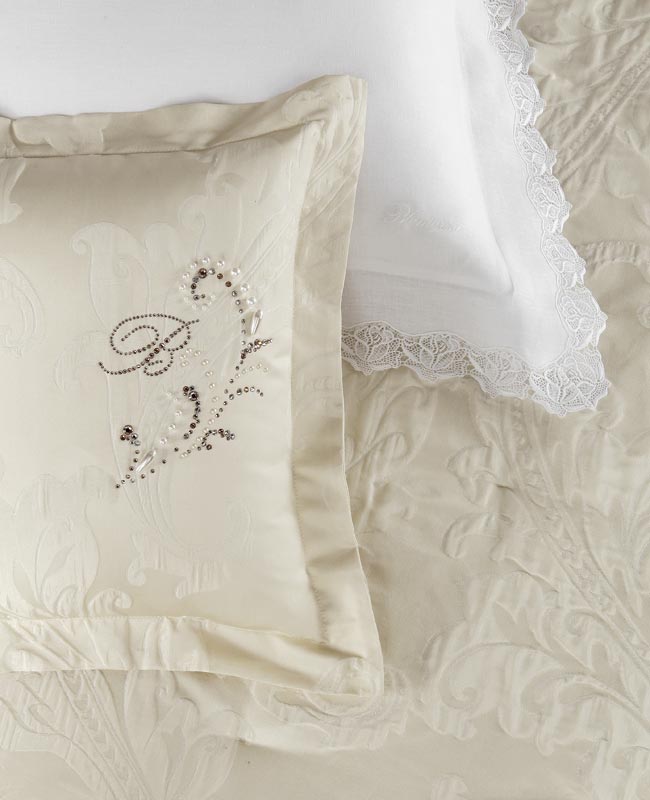 Pillow in jacquard with pearls, with Swarovski crystal decorations and pearls applied by hand.