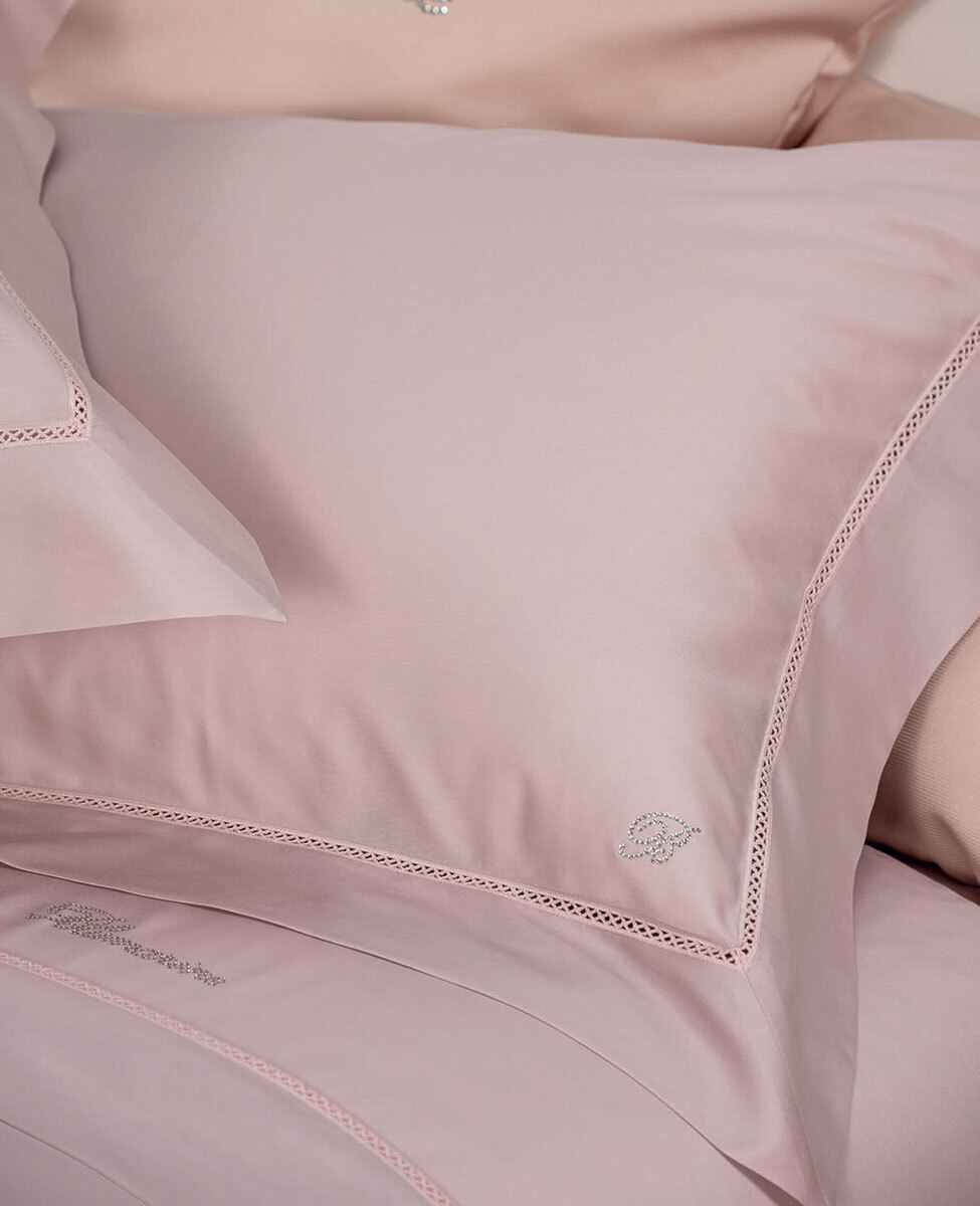Elegant duvet cover set for double bed with croquette finishing and logo in Swarovski crystals
