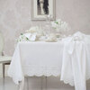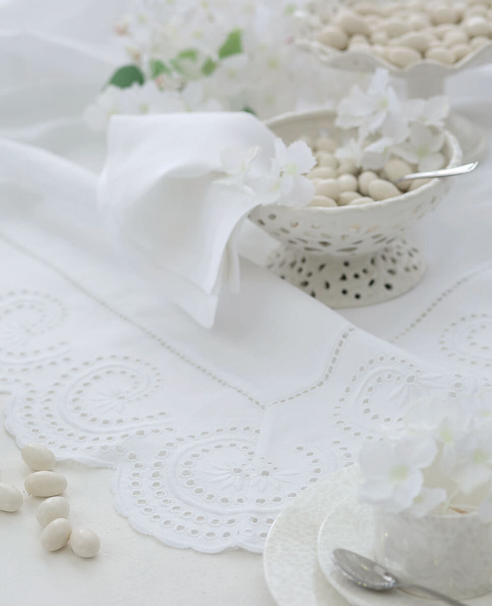 Tablecloth for 10/12-seats with broderie anglaise embroidered band and embroidered Blumarine logo, elegantly packed in box, perfect for a gift idea.