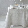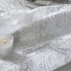 Table-cover yarn dyed jacquard with hemstitch and Blumarine logo in Swarovski crystals. Elegant, majestic, romantic, celebrate the mise-en-place.