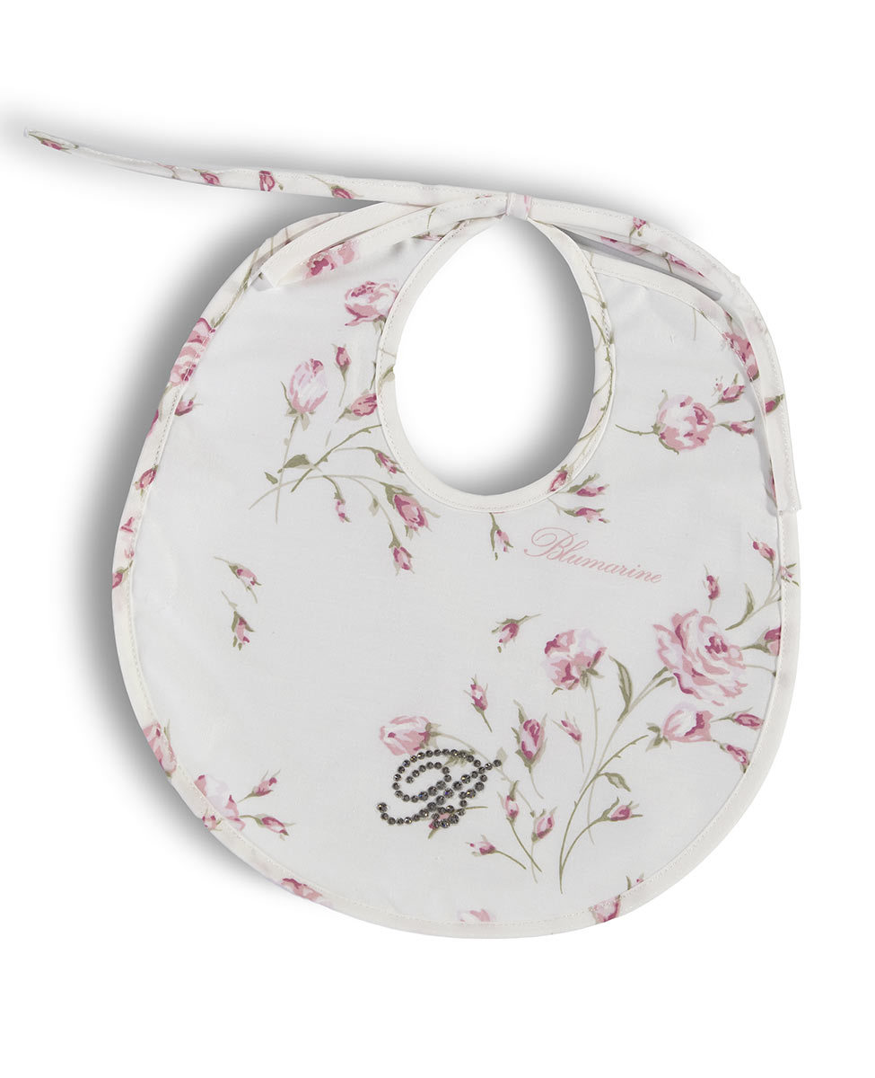 Bavaglino per neonato in percalle di cotone stampato con logo Blumarine in cristalli.
