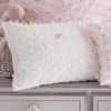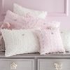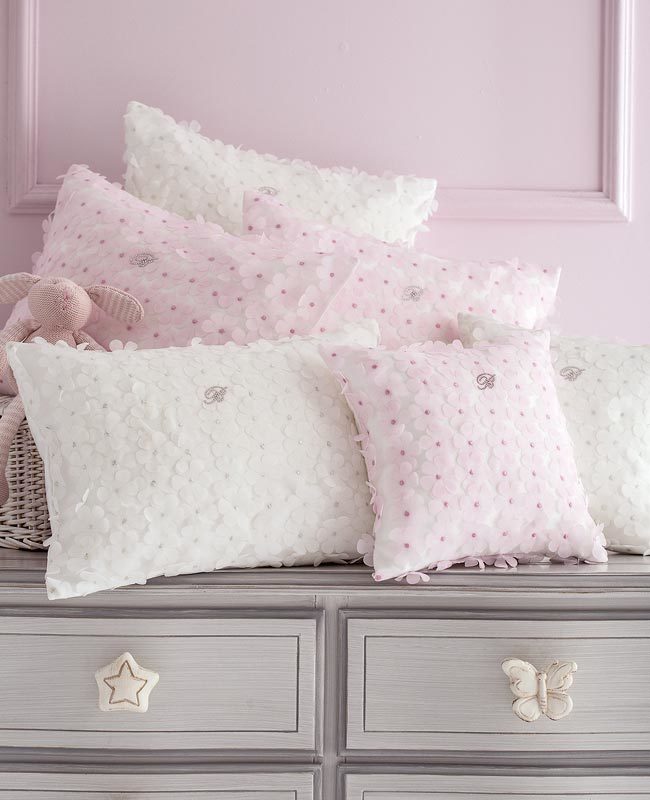 Cuscino decorativo in raso doppiato con tulle e fiori in organza applicati all over, logo Blumarine in cristalli Swarovski, retro in raso di cotone tinta unita.