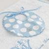 Bavaglino neonato con parte davanti stampa pois in piquet millerighe e logo Blumarine in cristalli Swarovski. Rifinito con piccolo smerlo stampato Sangallo. Retro in percalle tinta unita.