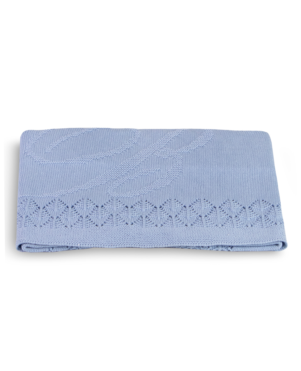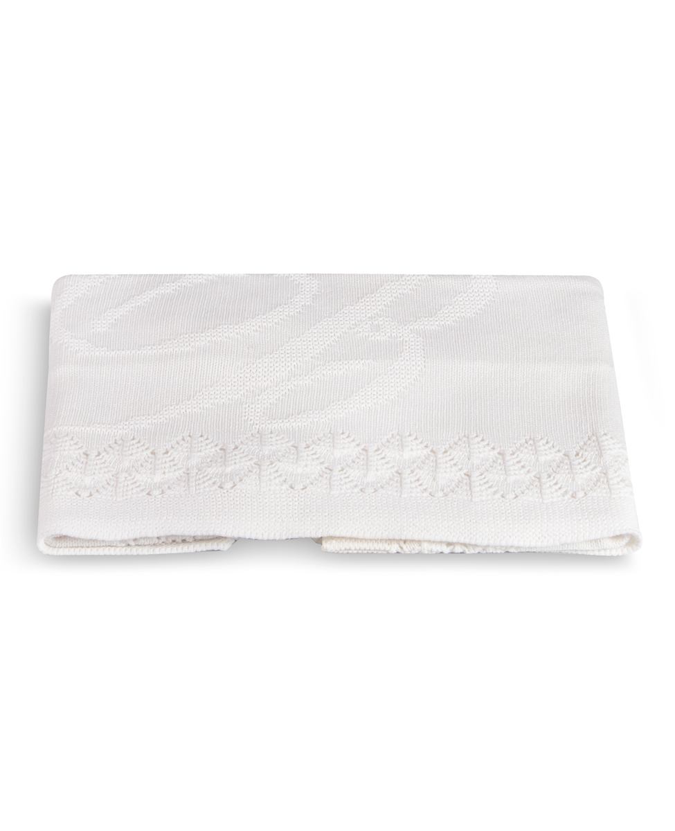 Morbida e fresca copertina per culla e carrozzina in cotone con disegno in jacquard piazzato, monogramma Blumarine e bordo punzonato.