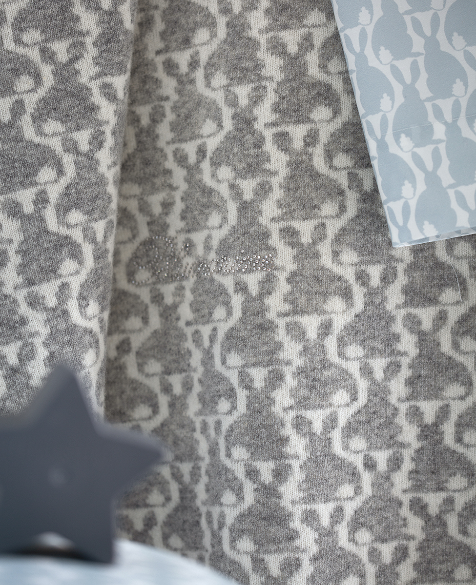 Copertina per culla e carrozzina con disegno in jacquard e logo Blumarine in cristalli.