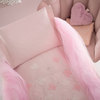 Completo copripiumino per culla in raso tinta unita, parte superiore sacca con ricamo farfalle in organza applicata in rilievo e logo Blumarine in cristalli Swarovski, parte inferiore doppiata con organza ricamata, interno estraibile a misura del piano letto, federa con 2 volani laterali, lenzuolo sotto con angoli.