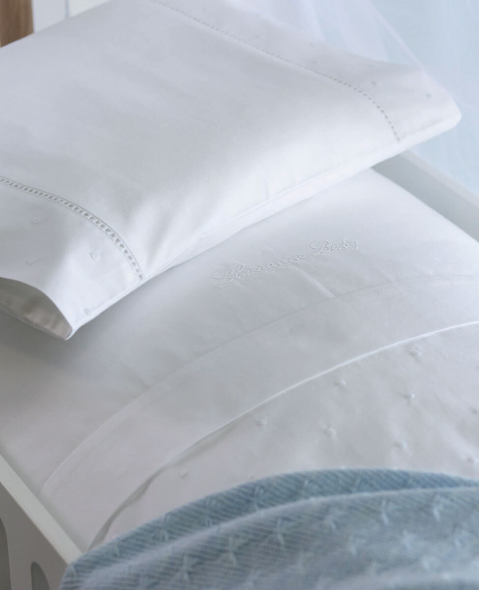 Completo copripiumino per culla ricamato con orlo a-jour e logo Blumarine ricamato.