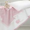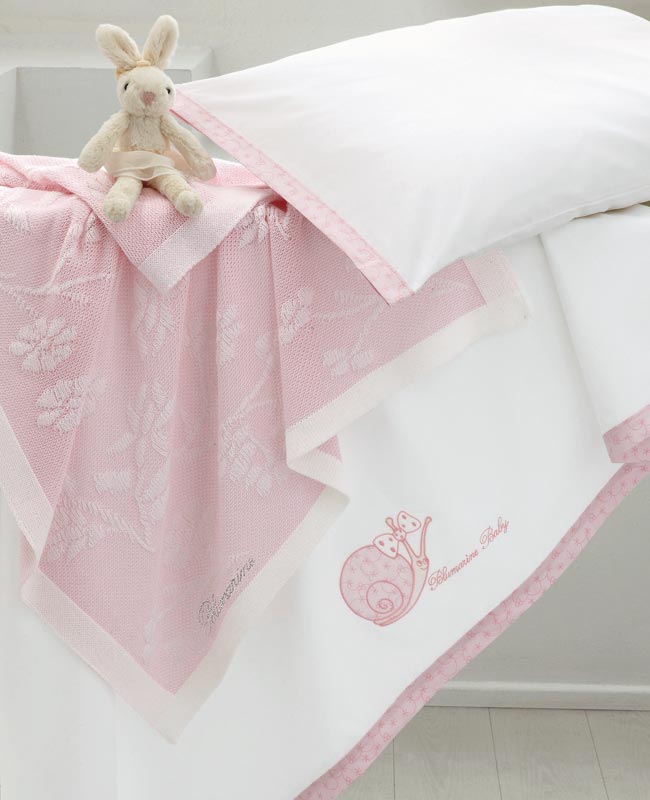 Completo lenzuola per culla in percalle bianco con Lumachina ricamata e logo Blumarine presente nel ricamo.