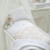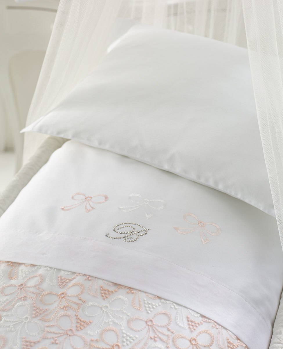 Completo copripiumino per culla in raso tinta unita ricamato con organza ricamata e logo Blumarine in cristalli Swarovski, parte inferiore doppiata con organza ricamata, retro sacca in raso tinta unita.