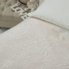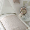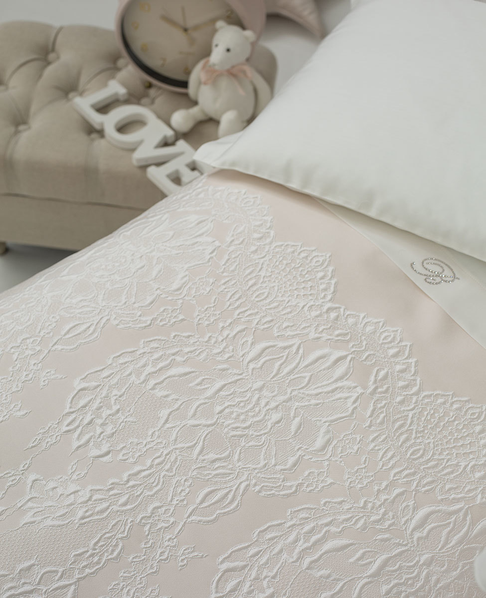Completo copripiumino per culla in raso di cotone tinta unita con logo Blumarine in cristalli Swarovski, parte sotto in misto seta jaquard.