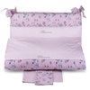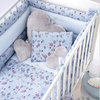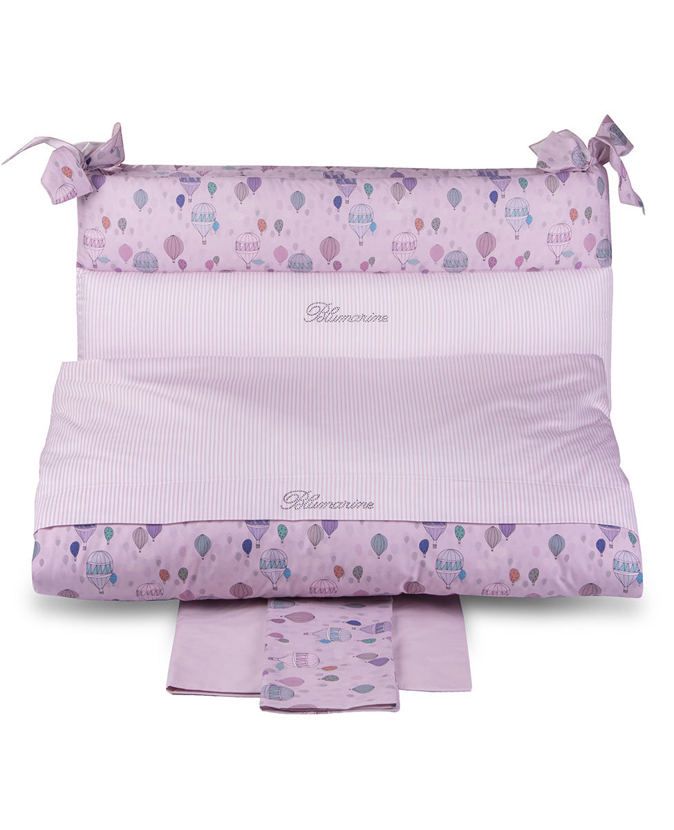 Completo copripiumino per lettino con delicata stampa su percalle di cotone e logo Blumarine in cristalli.