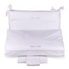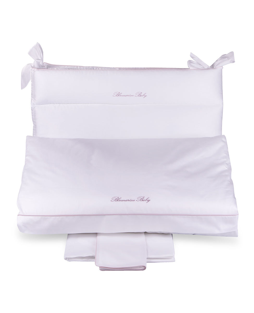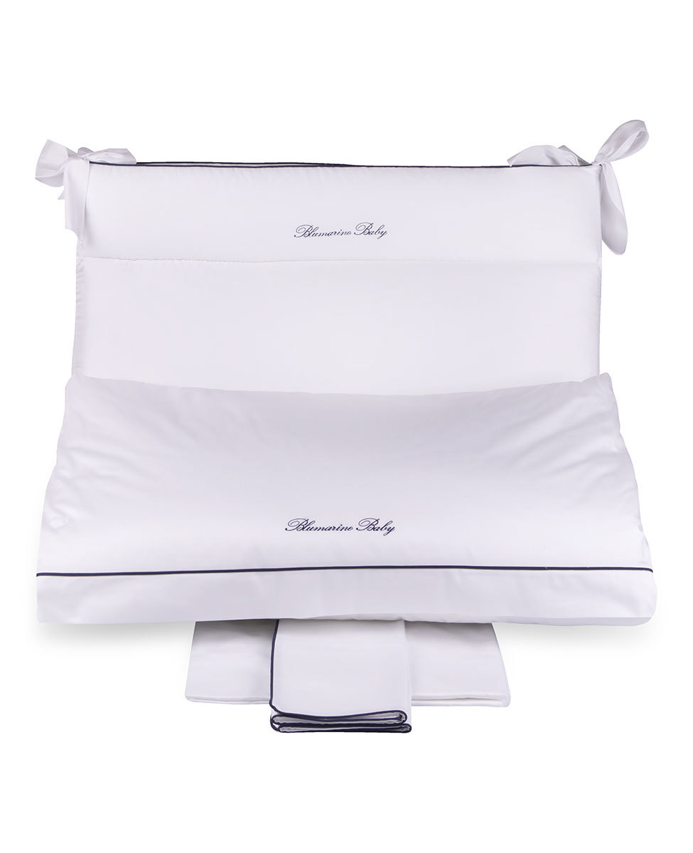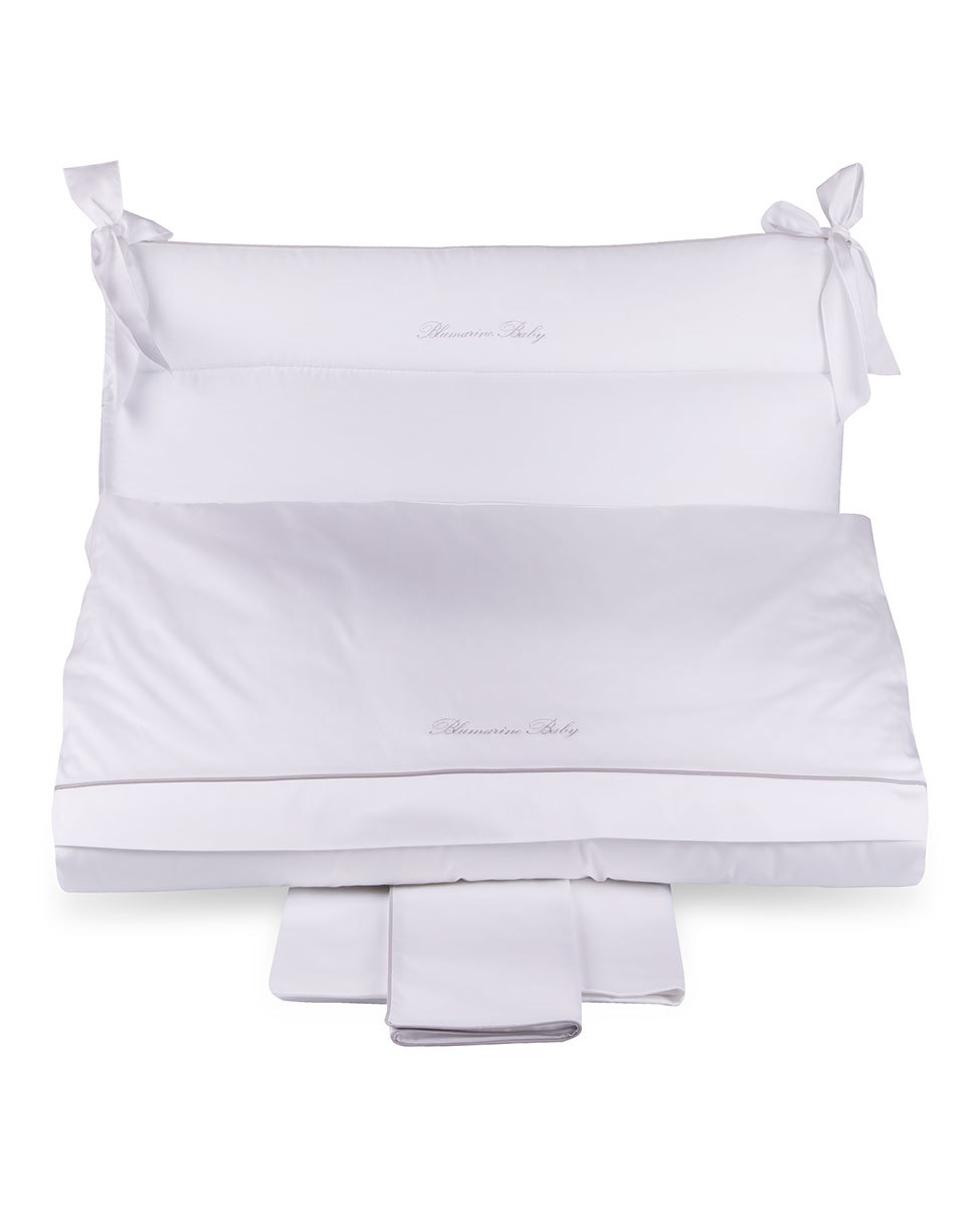 Completo copripiumino per lettino in raso di cotone tinta unita con profilo a contrasto e logo Blumarine Baby ricamato.