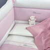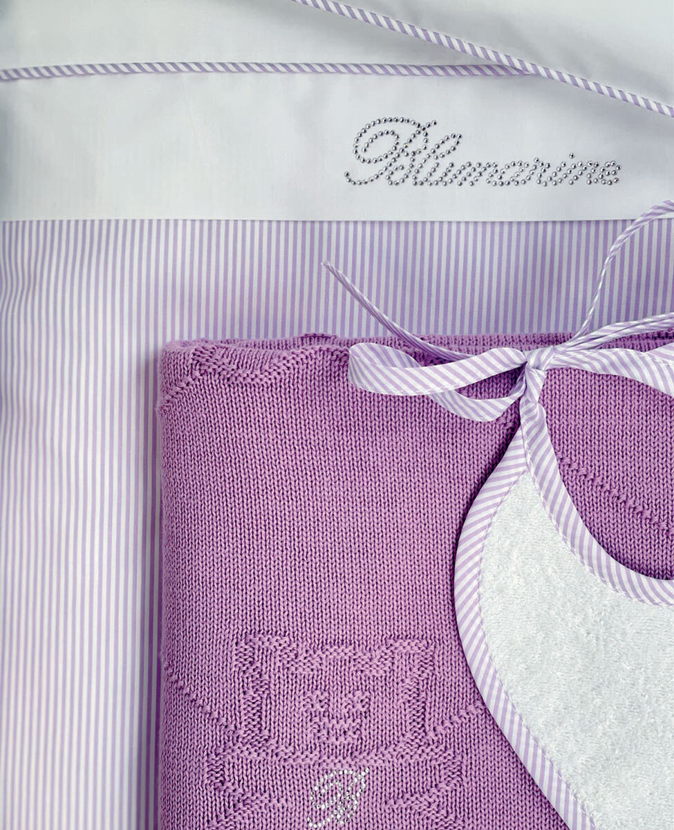• paracolpi lettino 205x45 cm in percalle tinta unita con righina tinta in filo, logo in cristalli, retro a righine tinto in filo, imbottitura da 550 g/mq