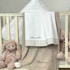 Completo lenzuola per lettino in percalle tinta unita e bordi in piqué millerighe stampato con logo Blumarine ricamato.