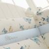 Paracolpi per lettino in percalle stampato a motivo farfalle, parte davanti con fascia centrale stampata a quadretti con logo Blumarine in cristalli Swarovski, le parti restanti ed il retro sono in percalle stampato farfalle.