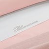Completo copripiumino bicolore per lettino in 100% percalle di cotone, parte superiore bianca con logo Blumarine in cristalli Swarovski, parte inferiore e sotto sacca colorate.