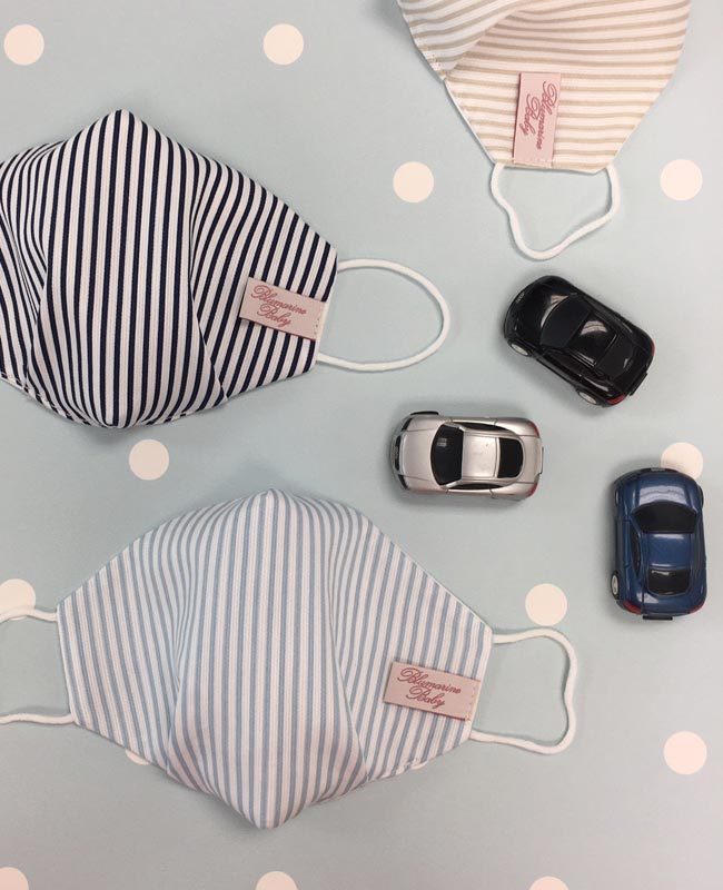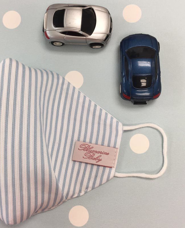 Mascherina a conchiglia per bambino con elastici auricolari colorati e bandierina applicata con logo Blumarine Baby, taglia 6/8 anni.