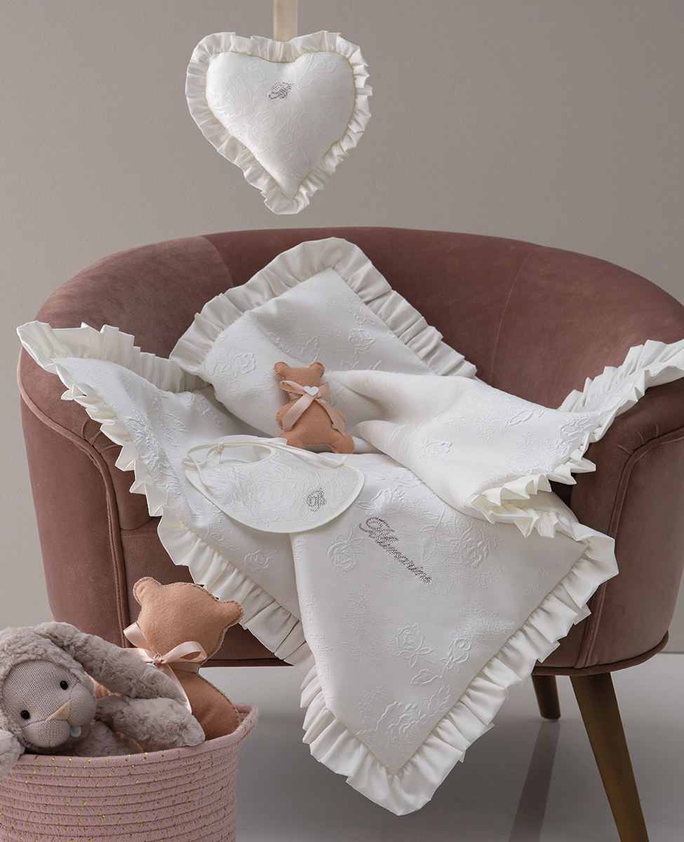 Bavaglino per neonato in jacquard con logo Blumarine in cristalli Swarovski e retro in raso di cotone tinta unita.