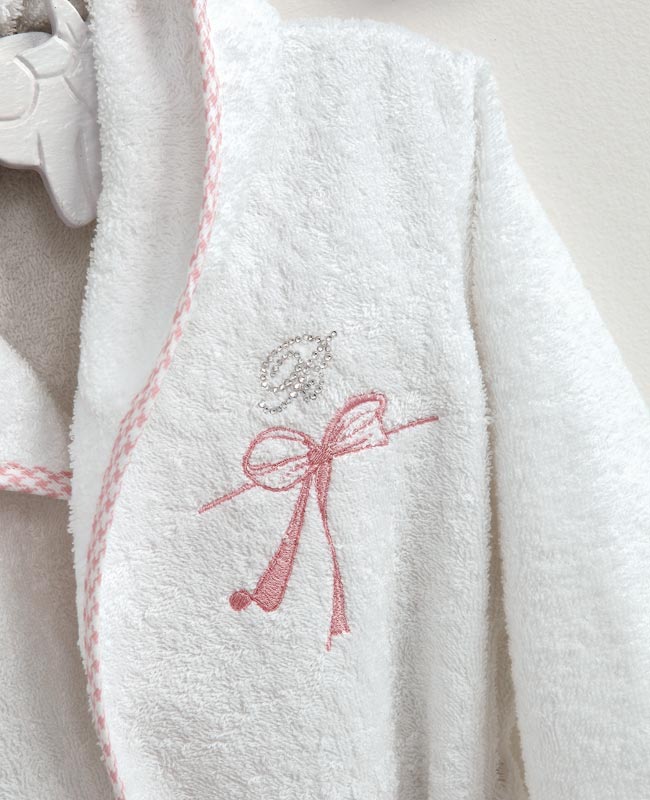 Accappatoio con cappuccio ricamato. Profilato con sbieco stampato in pied de poule e ricamo piazzato. Logo in Cristalli Swarovski.