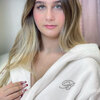 Accappatoio con cappuccio tinta unita in jacquard con trama a righe sottili, logo Blumarine in cristalli e tasche rimesse in applicazione, taglia L/XL.