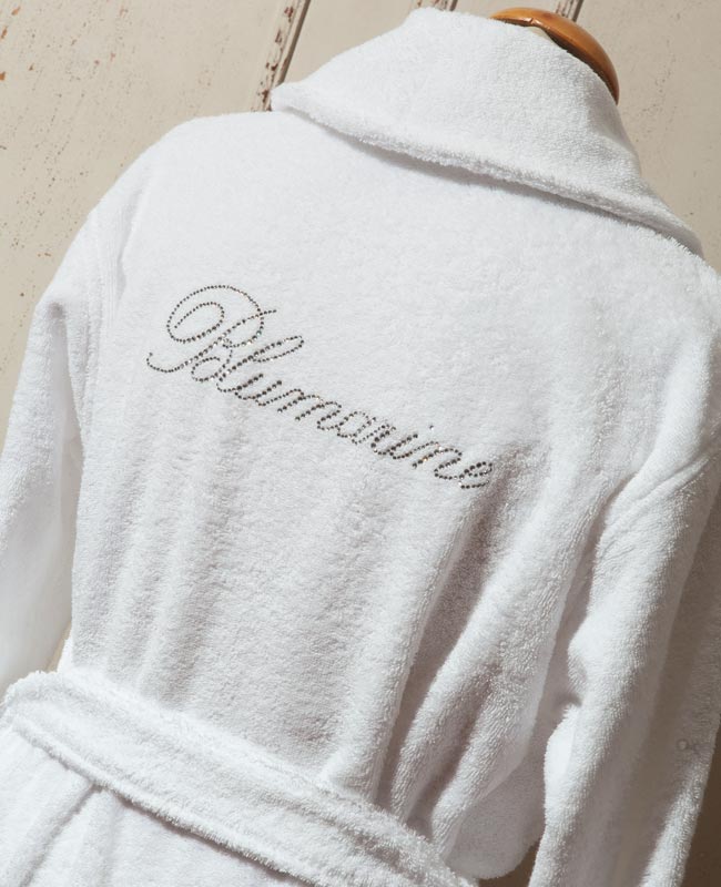 Accappatoio con collo sciallato e logo Blumarine in cristalli Swarovski posizionato sulla schiena.