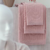 Coppia 1+1 di asciugamani in spugna di cotone jacquard con balza finale e logo Blumarine tinto in filo jacquard.