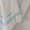 Coppia 1+1 di asciugamani in spugna di cotone tinta unita a nido d'ape con balza jacquard tinto in filo a righe e logo Blumarine ricamato.