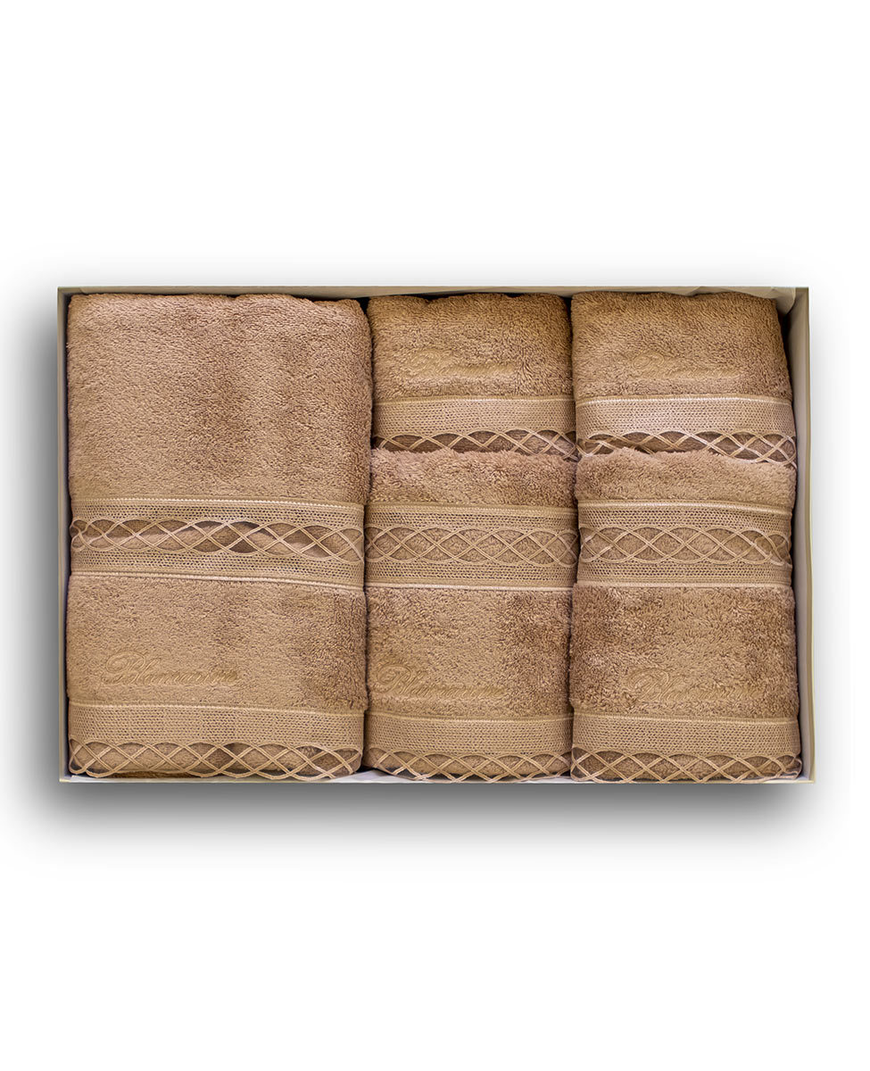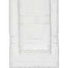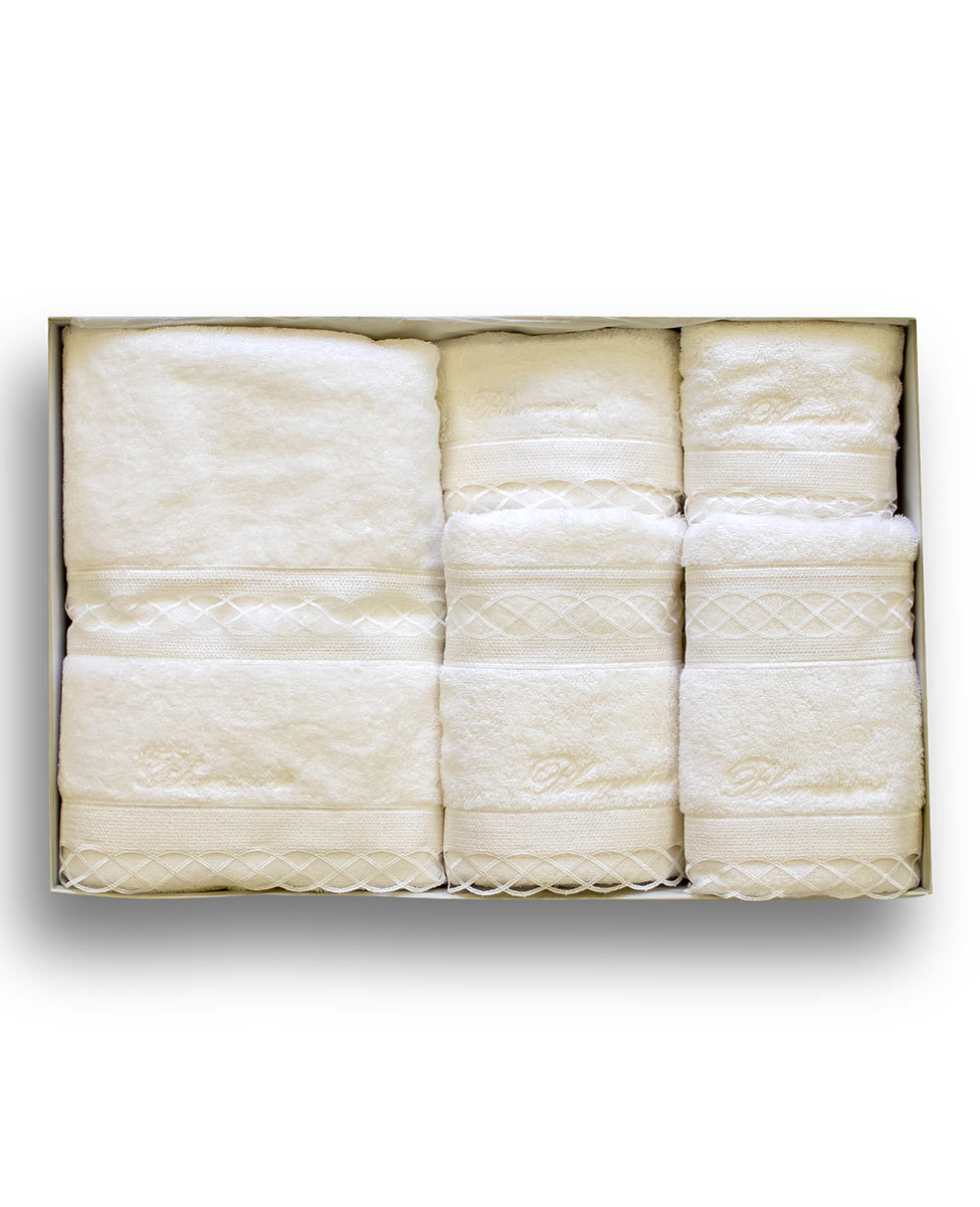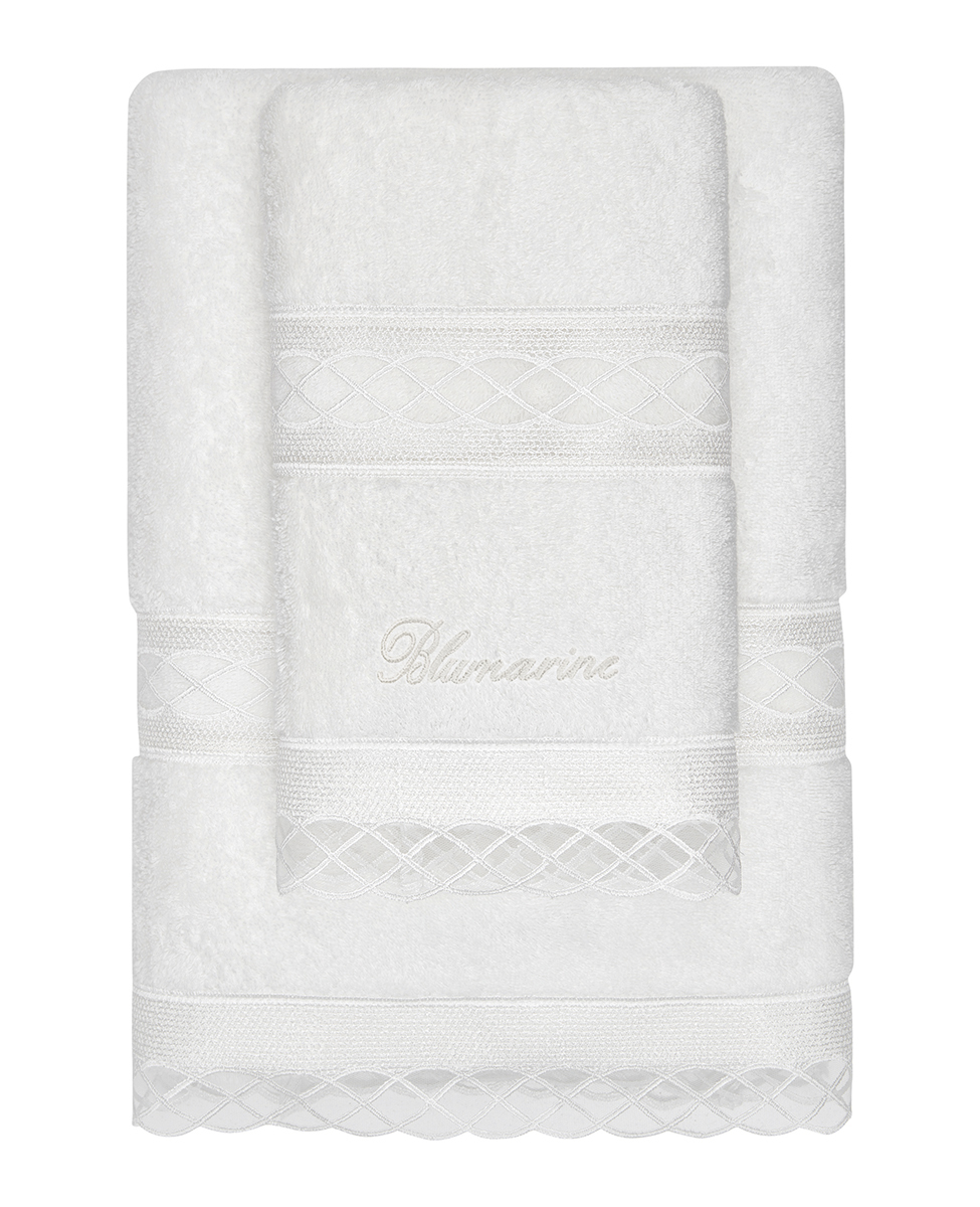 Set di 5 asciugamani in spugna di cotone idrofilo con lista in tulle cucita ad intarsio e logo Blumarine ricamato.