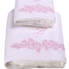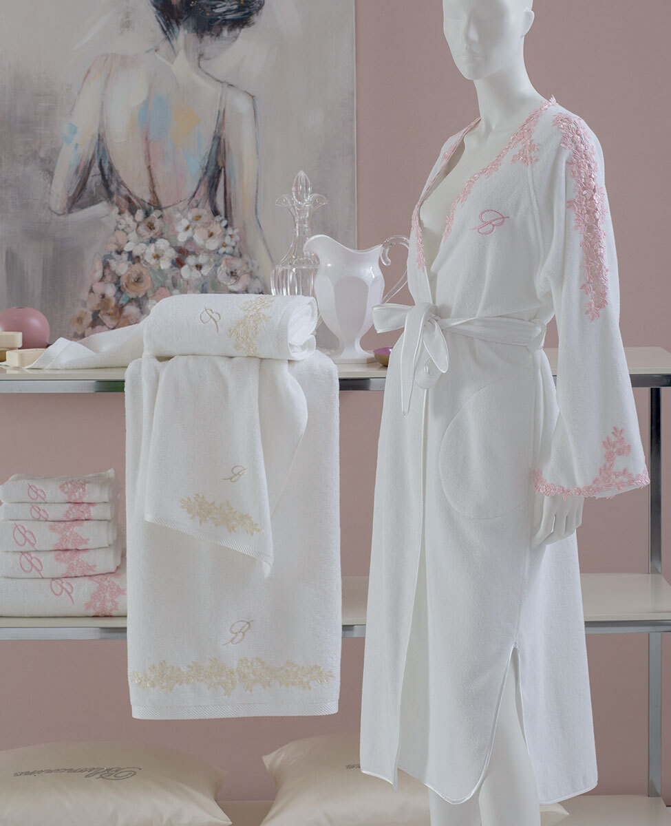 Set da 5 asciugamani in spugna di cotone idrofilo tinta unita con logo Blumarine ricamato e decoro in macramè.