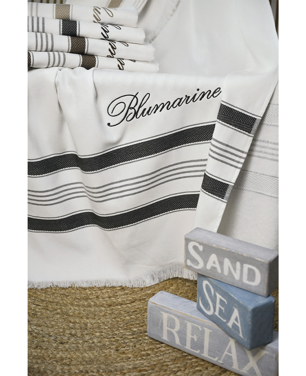 Telo mare tinta unita, elegante e raffinato, caratterizzato da doppie righe orizzontali tinto in filo e da un logo Blumarine ricamato lungo 25 cm.