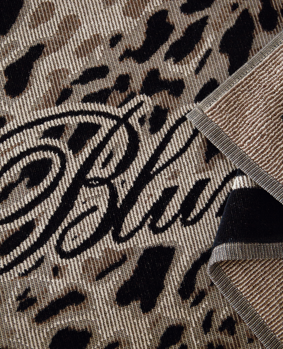 Telo mare in velour tinto in filo con disegno e logo Blumarine in jacquard piazzato, retro in spugna riccio.