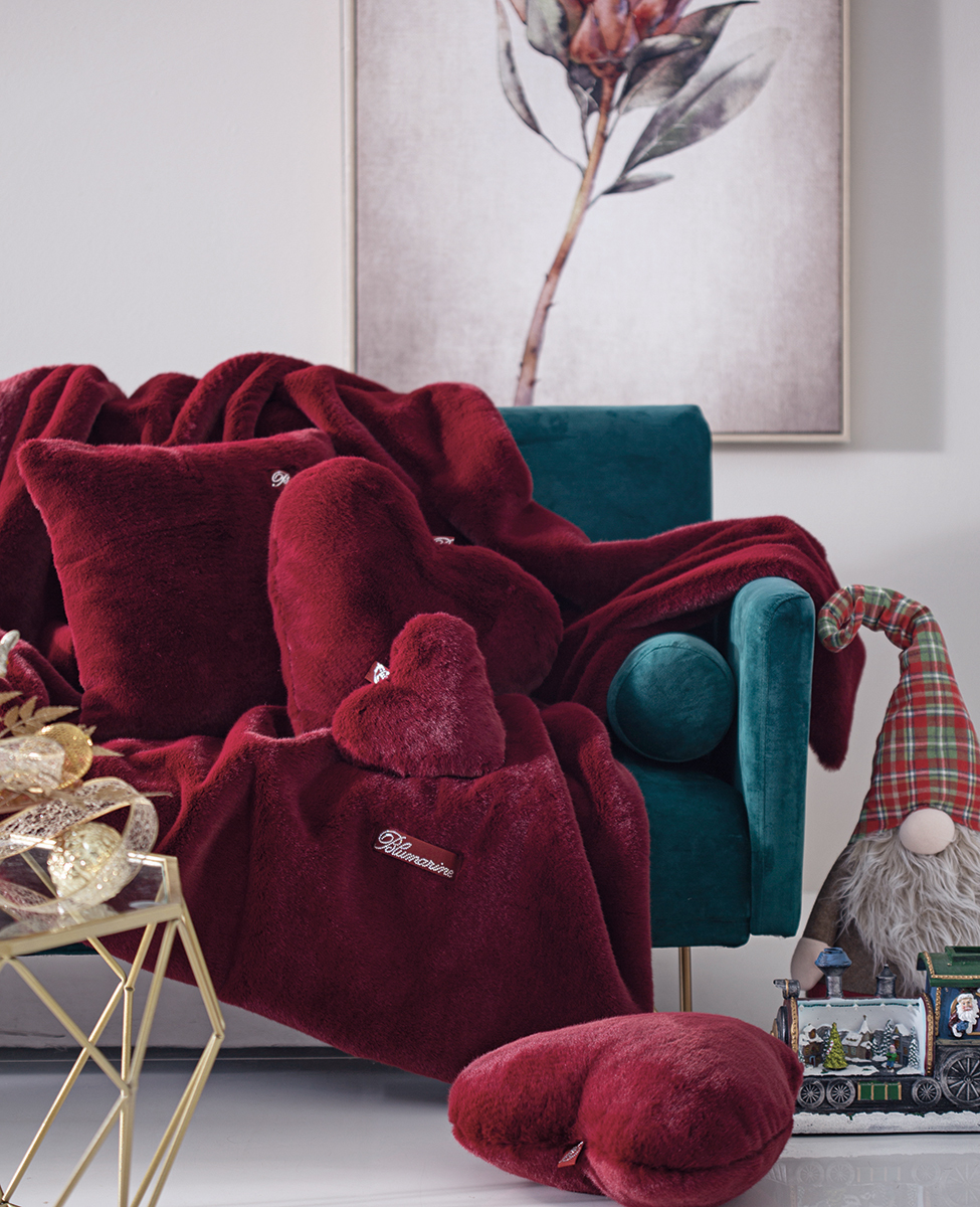 Cuscino grande a forma di cuore in eco pelliccia con logo Blumarine in cristalli su nastro gros grain.