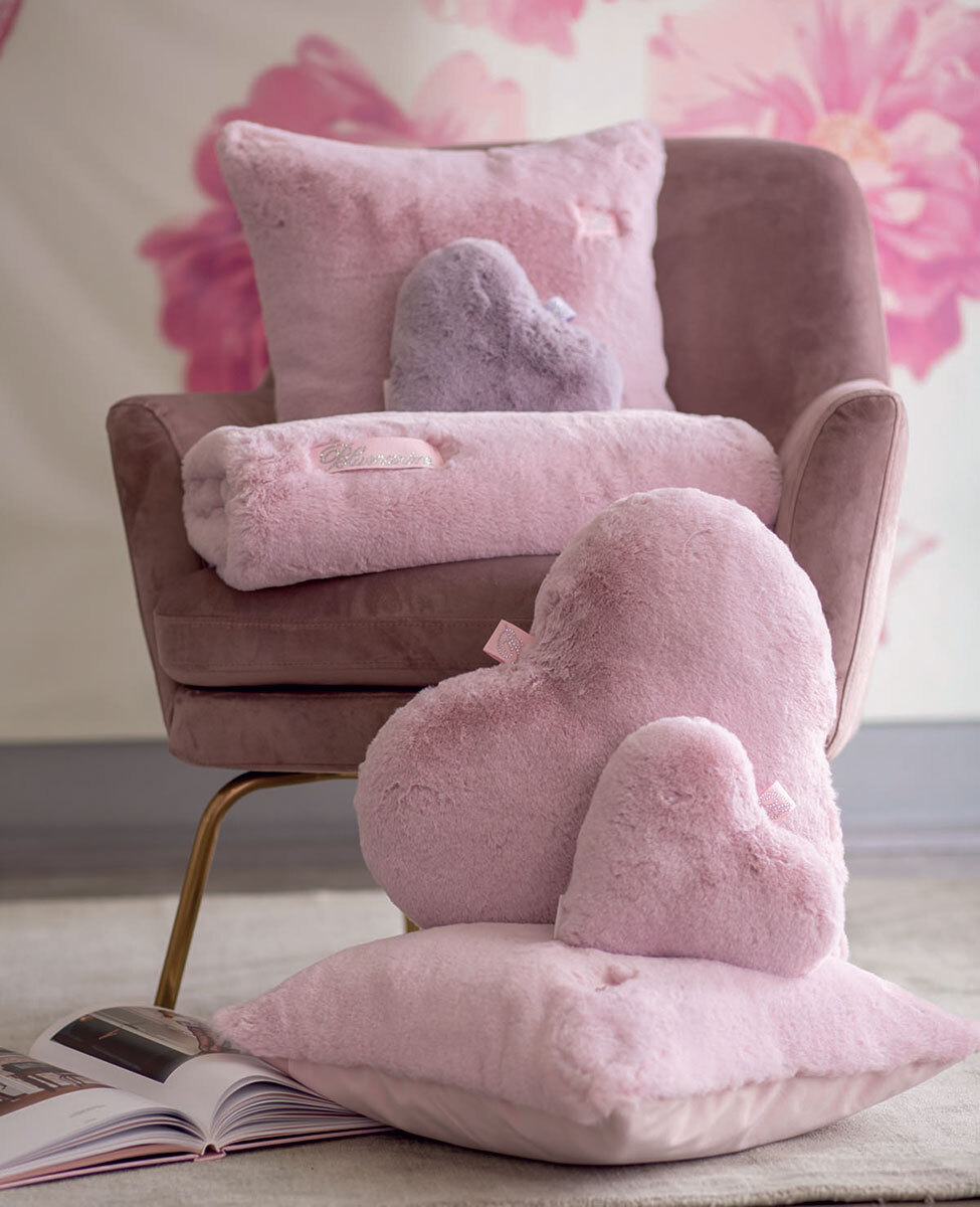 Cuscino grande a forma di cuore in eco pelliccia con logo Blumarine in cristalli su nastro gros grain.
