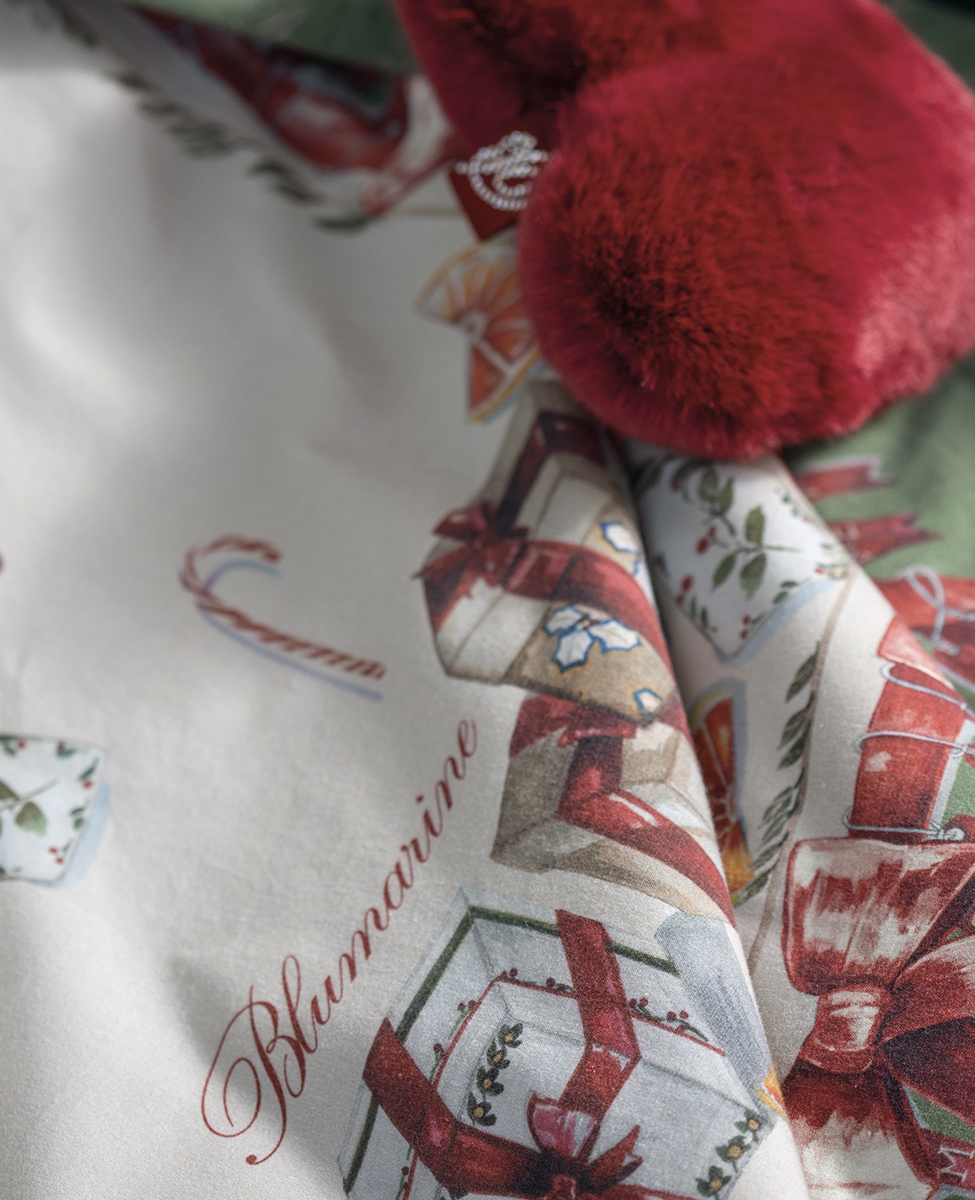Caldo pareo grazato con stampa piazzata e logo Blumarine in cristalli, tessuto del retro garzato e stampato con logo Blumarine all-over.
